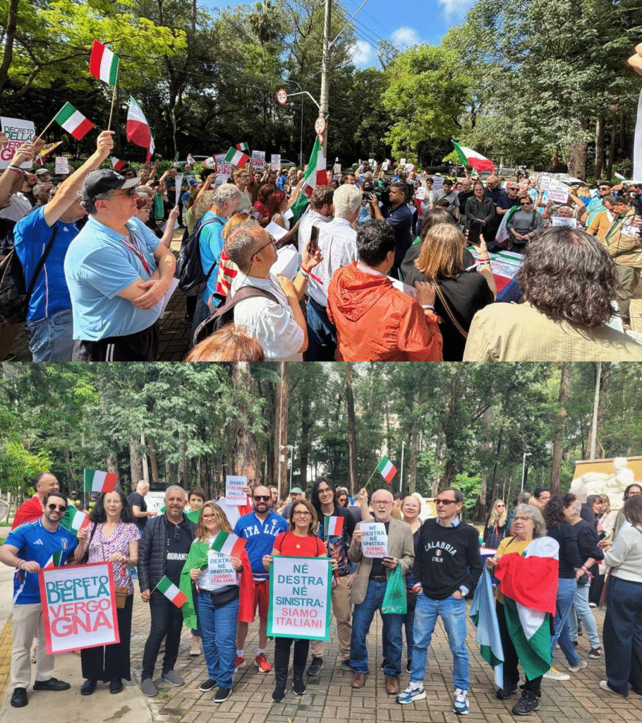 Empunhando bandeiras da Itália e cartazes de protesto, os manifestantes demonstraram de forma pacífica e organizada sua indignação diante de um decreto que, segundo eles, fere direitos adquiridos e compromete o princípio do ius sanguinis — a transmissão da cidadania italiana por descendência.
