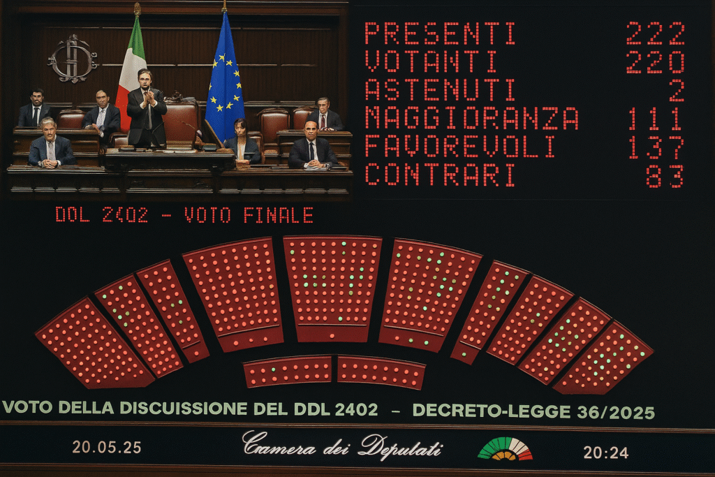 Na noite de 20 de maio de 2025, às 20h24, a Câmara dos Deputados da Itália aprovou em votação final o DDL 2402, correspondente ao Decreto-Lei nº 36/2025, mais conhecido como Decreto Tajani. Com 137 votos favoráveis, 83 contrários e apenas 2 abstenções, o texto passou com folga da maioria exigida de 111 votos. Um resultado que representa uma dura derrota para milhões de ítalo-descendentes espalhados pelo mundo.